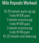 This week we have options for speed work. If you are training for a longer race, such as a half or full marathon or even a 15K you should go with the mile repeats and you should be doing more than this shows. I have talked a lot about the distances you should be running, so I would like to see what you have retained and how important your goals are to you… π