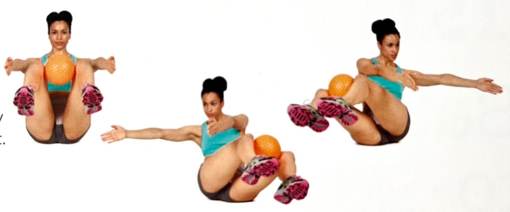 - Start by sitting with a weighted ball between your knees. If you don’t have a medicine ball, use a pillow! This won’t be as heavy but squeezing your legs together to secure the pillow will have a smilier effect as holding the medicine ball.