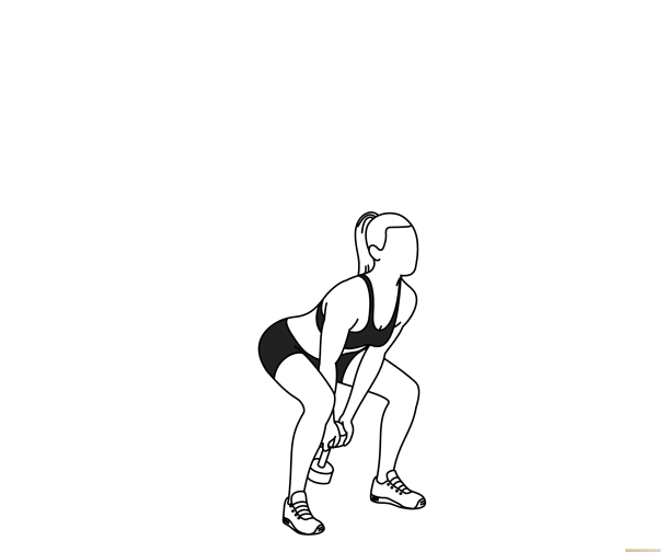 - Squat and bring the dumbbell between your legs.