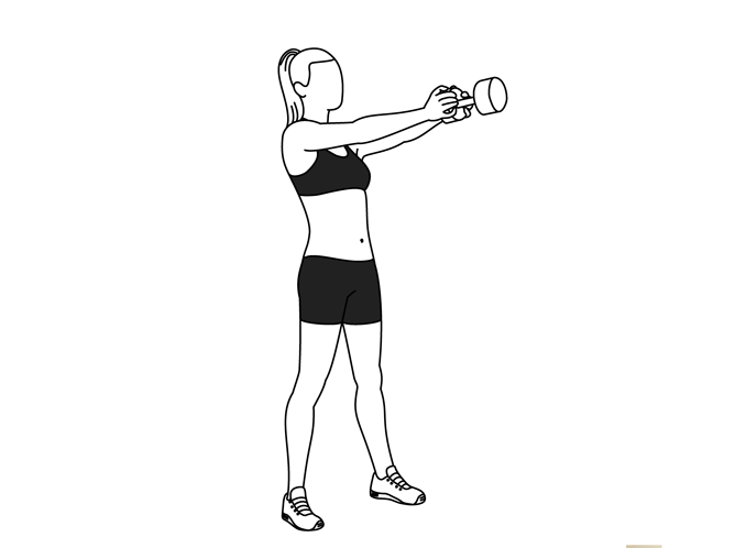- Stand up and swing the dumbbell up to about chest height.