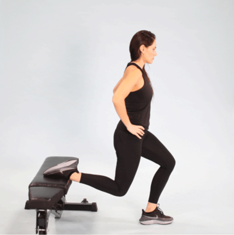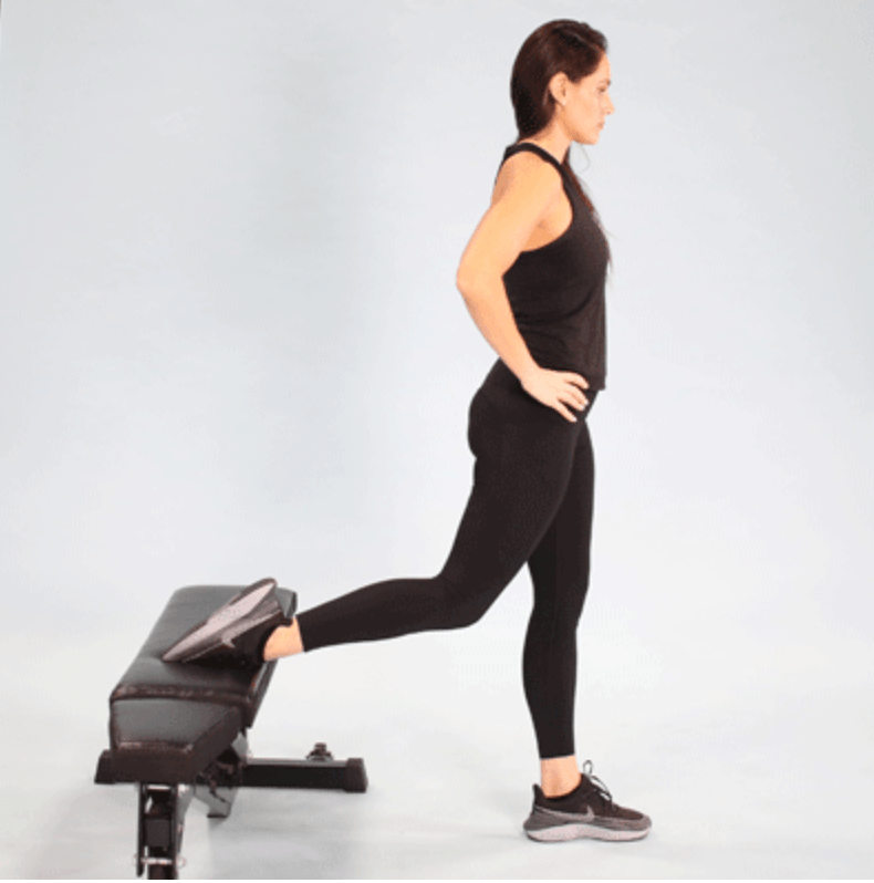 - Lift your right leg up behind you and place the top of your foot on the bench. Your feet should still be about shoulder-width apart and your right foot should be far enough in front of the bench where you can comfortably lunge/hop around a bit so you can find the right spot. If a closer foot position works, just ensure that when you lower down, your left knee doesn’t fall over the line of your toes.