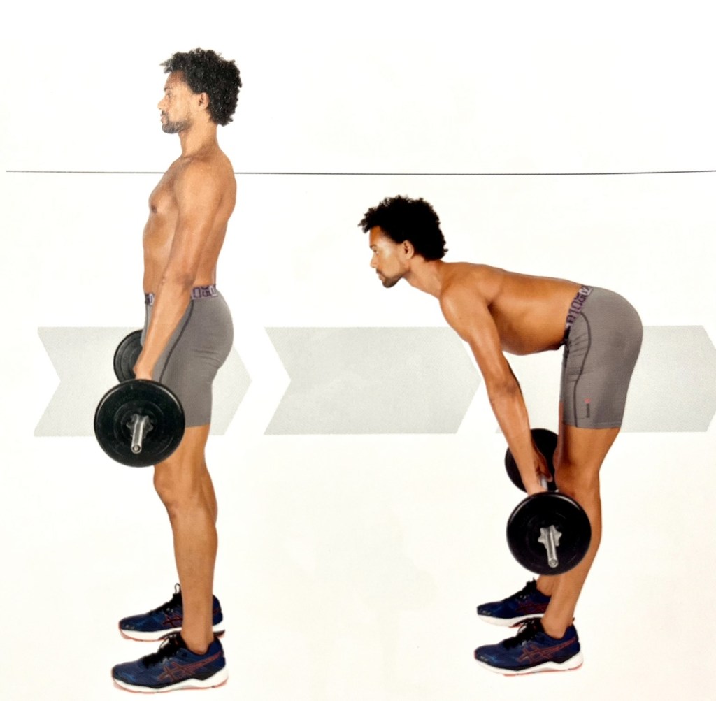 - Stand tall with your barbell or dumbbells held directly in front of your thighs.