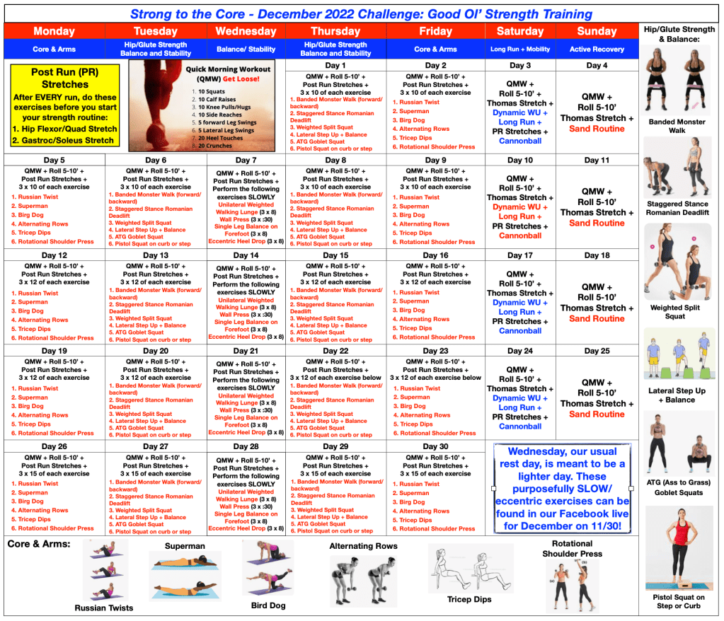 Our December Strength Challenge Calendar is below. Pictures for each exercise are shown on the calendar (except for Wednesday) but these are just reminders! Please join us on Wednesday evening, 11/30, at 8pm EST for our Strong to the Core Facebook LIVE to see demonstrations for ALL our exercises for this month!
