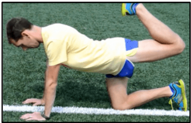 Donkey Kicks (3 sets of 10 reps each leg) – In a table top position with your hands under your shoulders and knees under your hips, kick your foot back like youβre trying to push the ceiling higher. Swing your leg back underneath your body without letting your knee touch the ground and repeat.