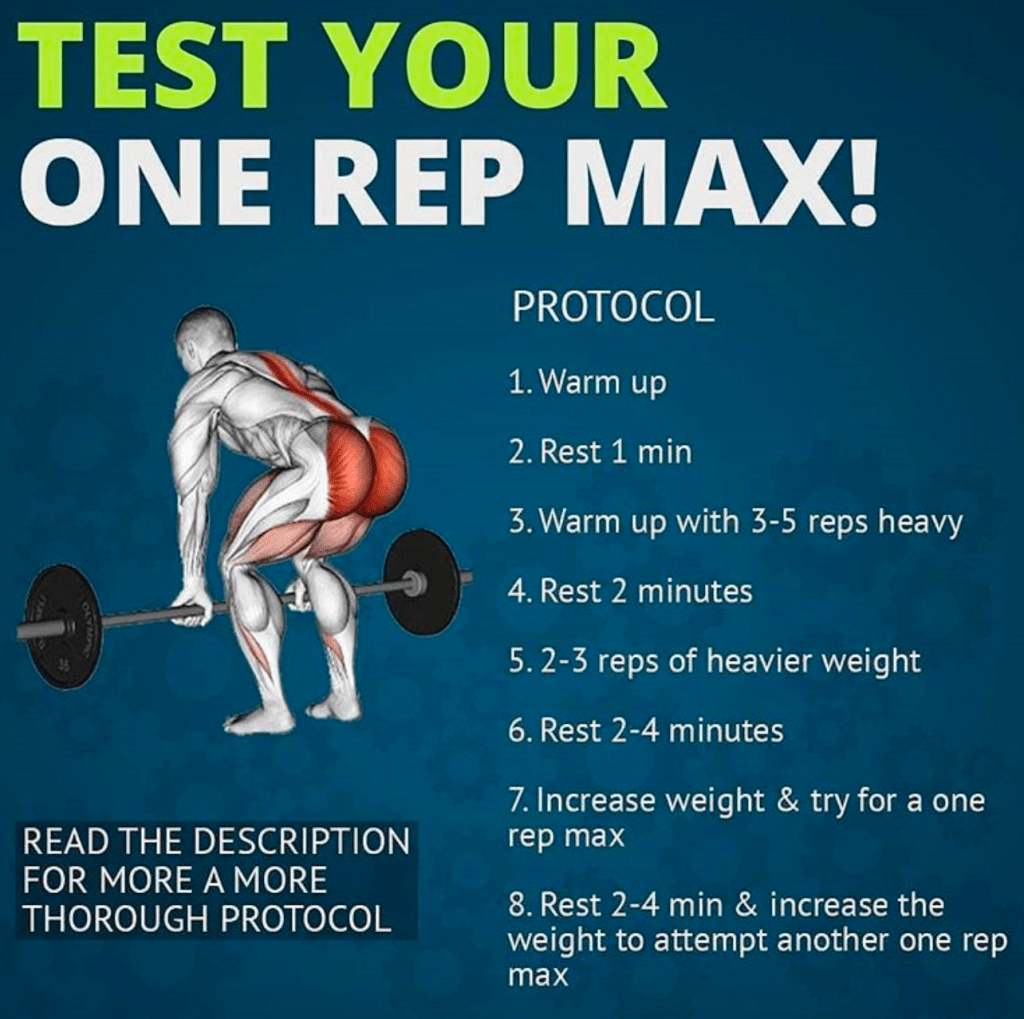 Also, allow twenty-four hours of rest time for a muscle before performing a 1RM test. Don’t perform this test in the afternoon if you had a morning workout of the same muscle group.