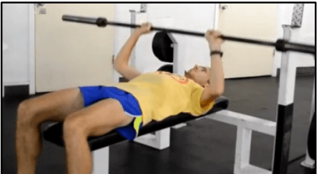Bench Press (3 sets of 8 reps) – Lie on your back on the bench and grab the bar with your palms facing away from you with a grip slightly wider than the shoulders. Brace the abs while squeezing the glutes and shoulder blades and lift the bar off the rack. Lower the bar to your chest and back to the starting position. Look straight up and use a spotter for safety. Keep the motion slow and controlled.
