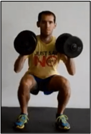 Weighted Squats (3 sets of 6 reps) – Stand with your feet shoulder width apart and your toes pointing straight ahead. Itβs also ok if your toes are pointing slightly out. Hold a dumbbell at shoulder height in each hand and sit back like youβre sitting in a chair until your thighs are parallel to the ground. Drive your heels down and return to the standing position, ensuring your lower back stays in a neutral position.