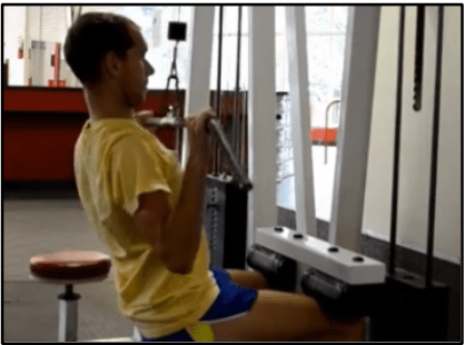 Lat Pull Down (3 sets of 8 reps) – Sit on the lat pull-down machine and grab the bar with your palms facing away from you at about shoulder width. Lean back about 30 degrees and stick your chest out, then pull the bar down until it touches your chest. Return to the starting position. Make sure to keep the motion slow and controlled and keep your upper torso stable.